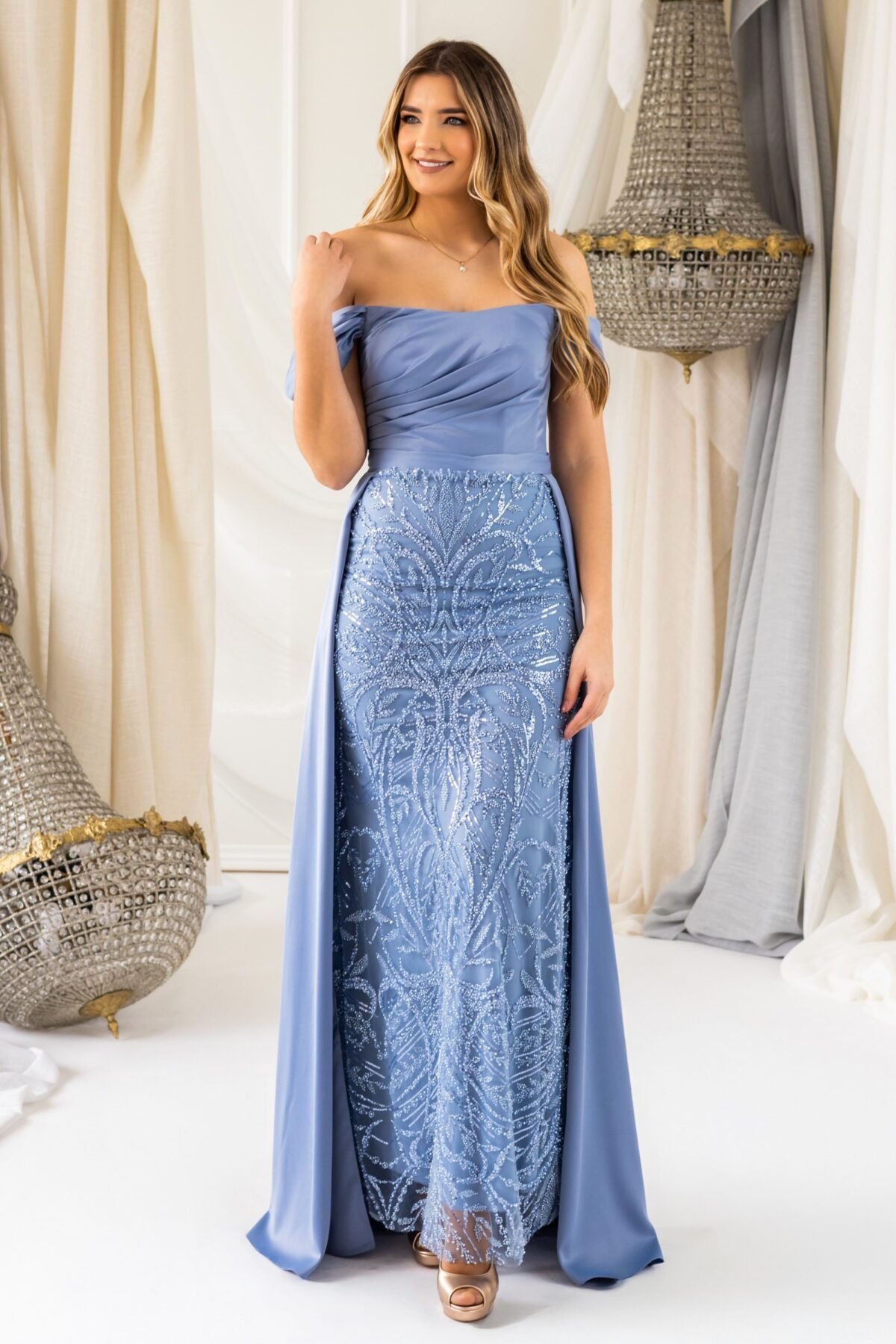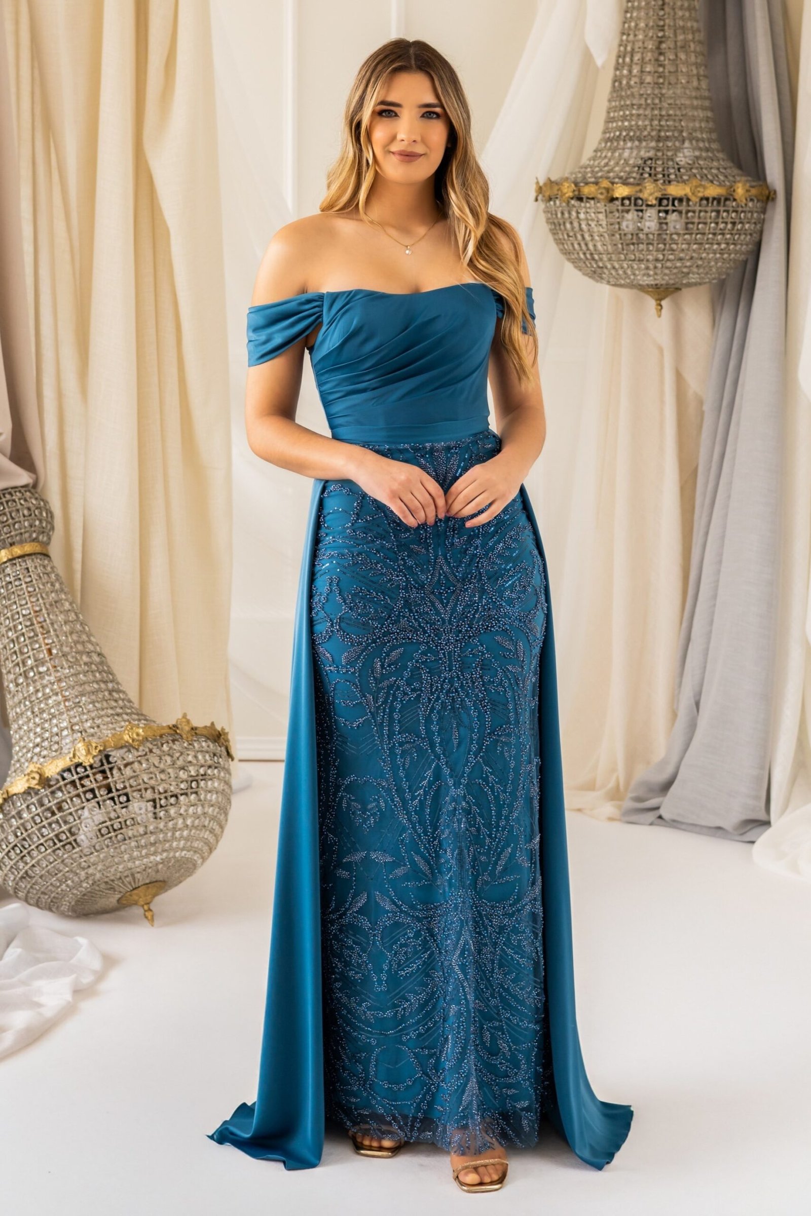Este vestido verde menta é a personificação da sofisticação e delicadeza. O modelo Denise destaca-se pelo corpete em crepe com drapeado suave, que molda o busto e os ombros com um elegante decote cai-cai acompanhado por mangas caídas, conferindo um charme romântico à silhueta. A saia apresenta uma sobreposição bordada em arabescos com lantejoulas aplicadas meticulosamente, criando um efeito cintilante e texturizado de tirar o fôlego. A parte traseira surpreende com um detalhe em laçada cruzada, garantindo um ajuste firme e feminino. A leve cauda fluida completa o visual com um toque de realeza, ideal para cerimónias ou ocasiões especiais onde o brilho subtil e a elegância clássica são indispensáveis.