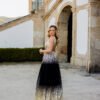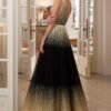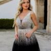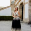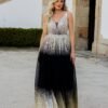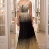 Este deslumbrante vestido longo da coleção Marfil Barcelona é uma verdadeira obra-prima de moda e sofisticação. Confecionado em tecido tule plissado com acabamento cintilante, apresenta um efeito elegante degradê que transita harmoniosamente entre o dourado e o preto, criando um visual impactante e sofisticado.