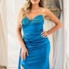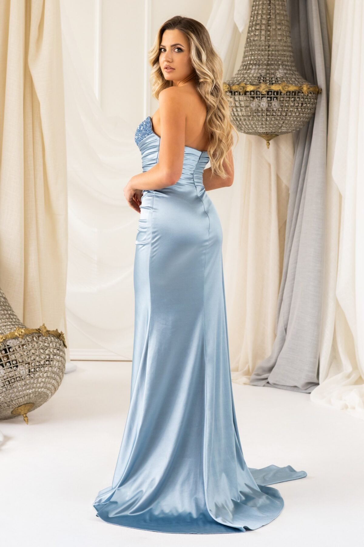 O corpete justo em forma de coração é ricamente adornado com lantejoulas, criando um brilho delicado que capta a luz com cada movimento. A zona da cintura é envolvida por um elegante drapeado que esculpe a silhueta com charme, enquanto a saia em corte sereia com abertura lateral acrescenta sensualidade e leveza ao caminhar.