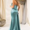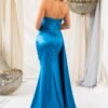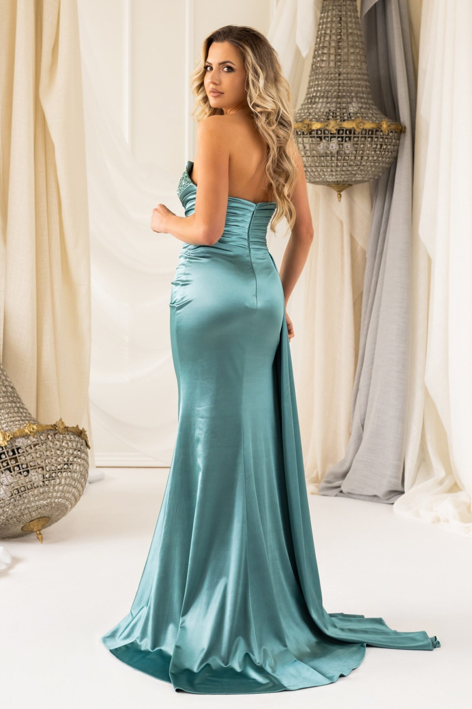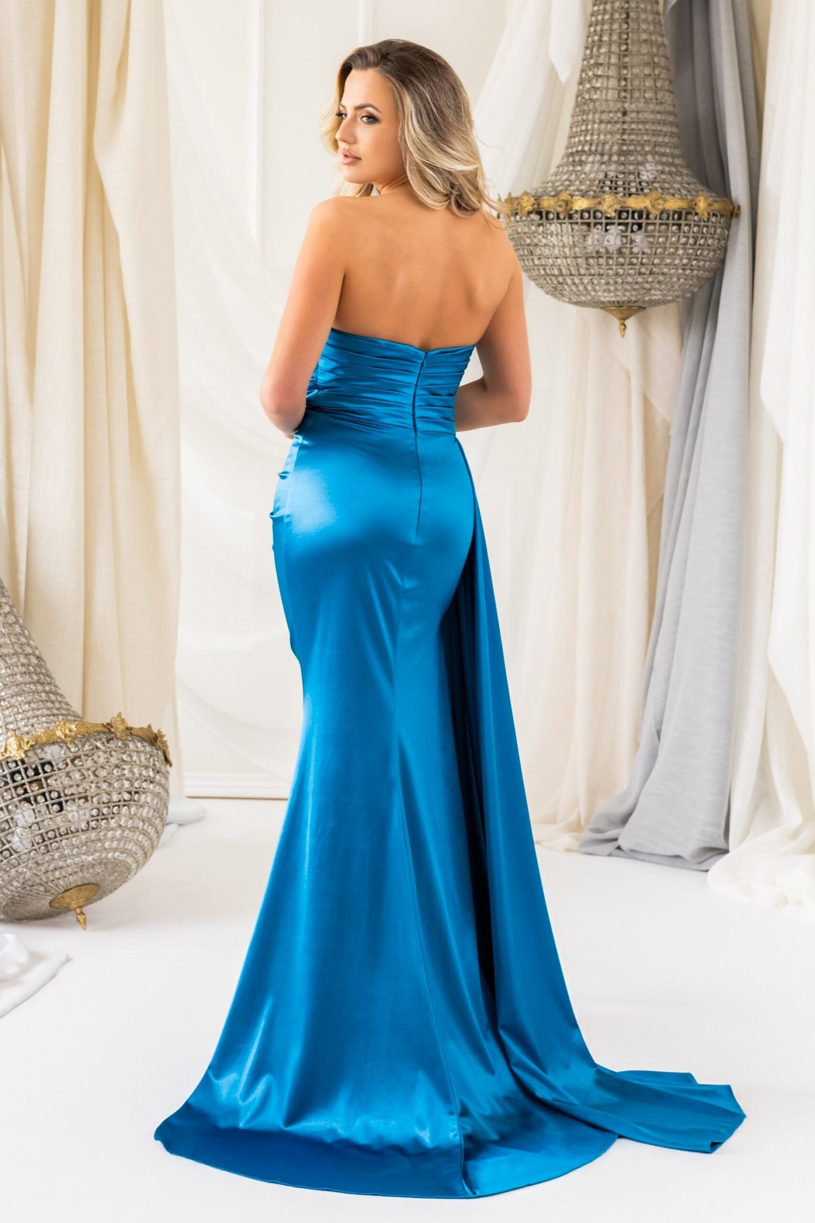 O tecido acetinado oferece um acabamento luxuoso e fluido, prolongando-se até uma pequena cauda que reforça o seu efeito dramático.