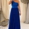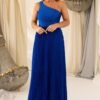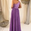 Corpete com um drapeado suave que valoriza o busto, enquanto a cintura marcada garante a definição da silhueta. A saia longa em plissado vertical adiciona fluidez e movimento, que cria um efeito visual alongado e glamoroso.