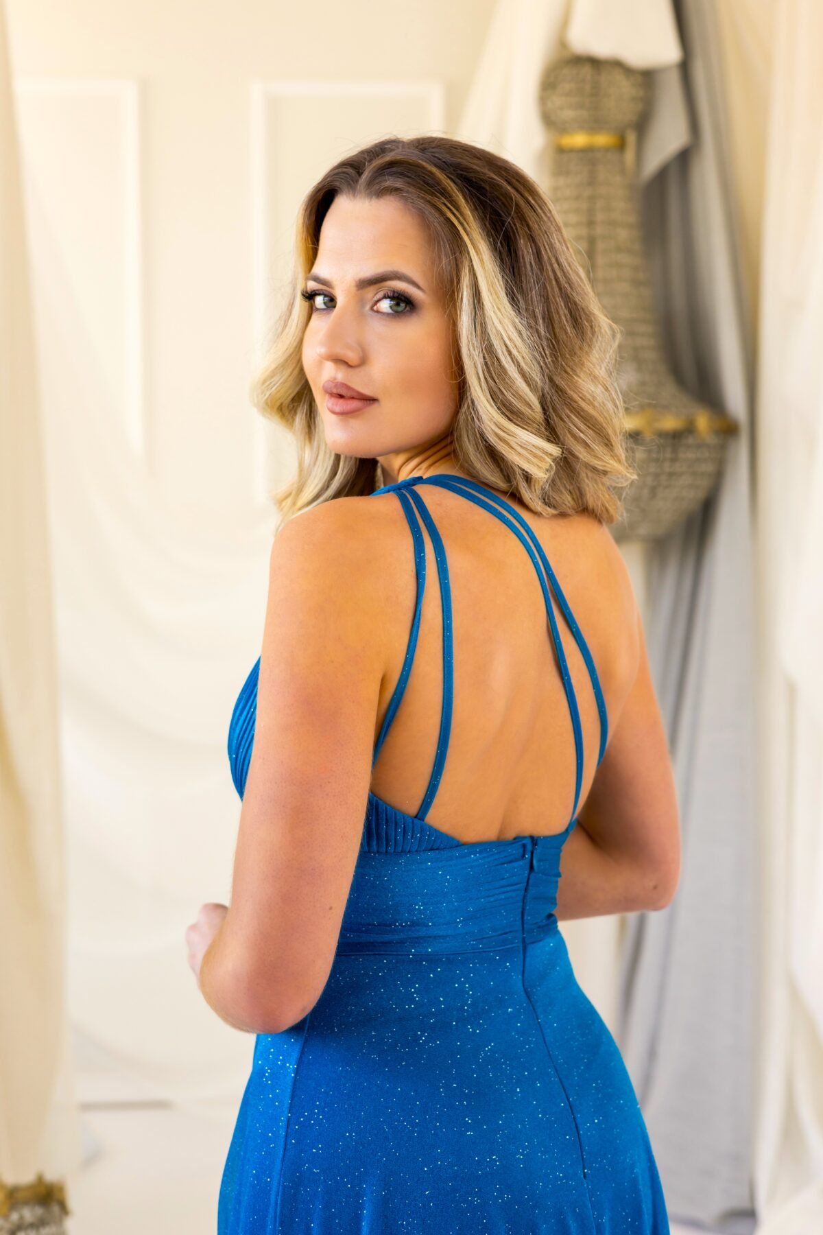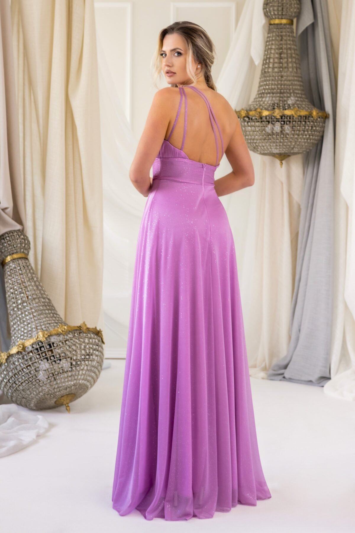 As costas revelam alças finas cruzadas e um decote profundo em V, reforçando a elegância do vestido com um toque inesperado. O forro interior garante conforto ao longo de todo o evento.