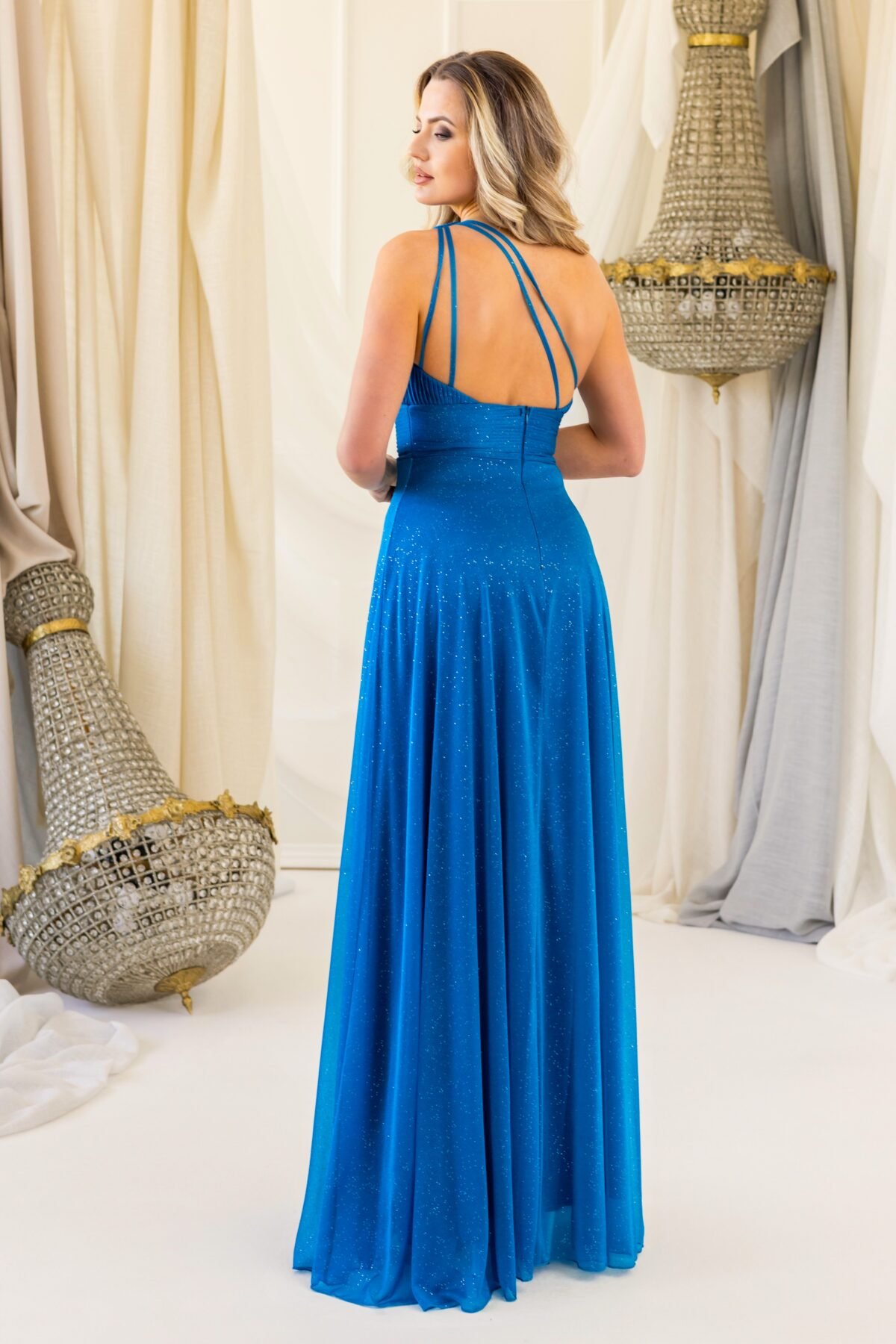 Confecionado em tule brilhante com textura fina, este modelo destaca-se pelo corpete plissado com decote assimétrico e aplicação de tule nude ao centro, criando um subtil jogo de transparências. O corte justo na zona da cintura valoriza a silhueta, enquanto a saia fluída com racha frontal garante movimento e ousadia na medida certa.