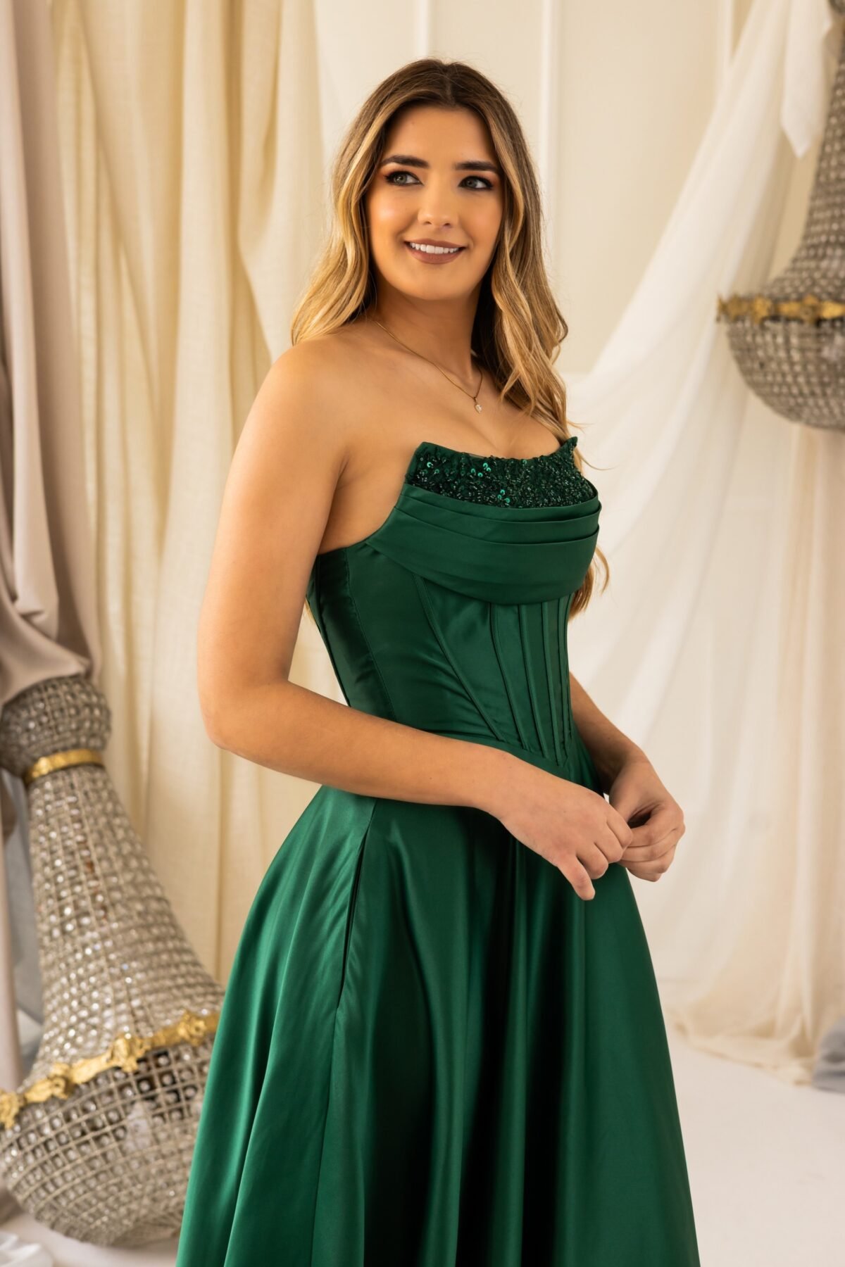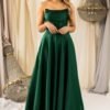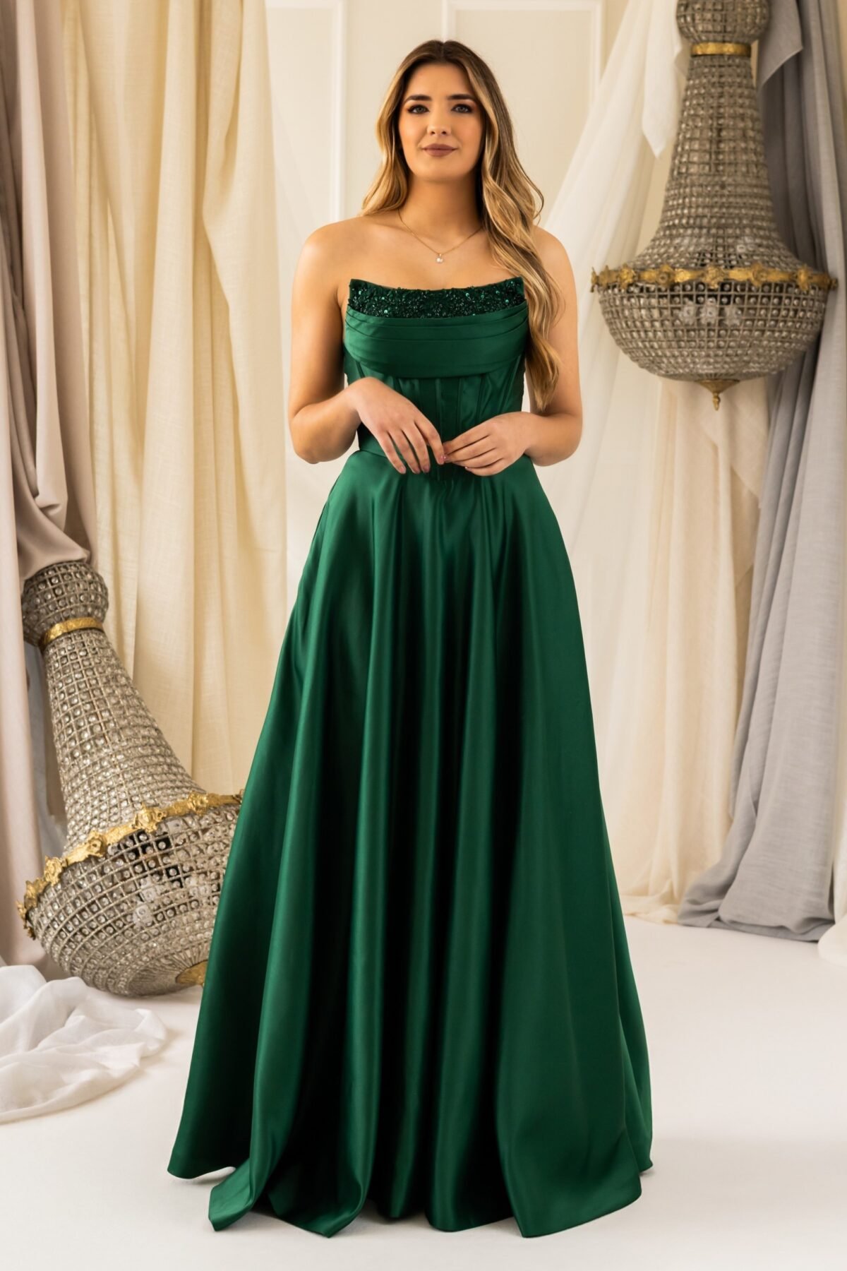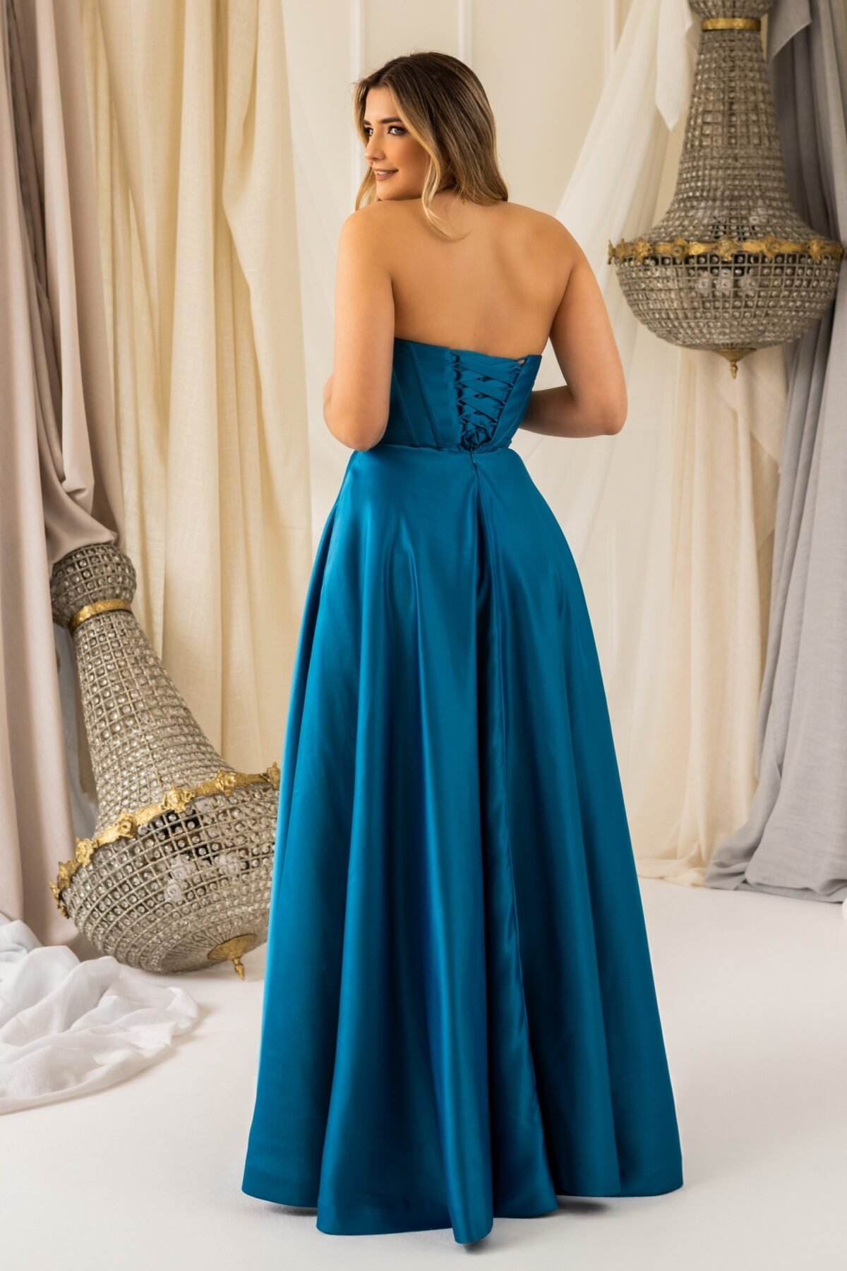 Este elegante vestido de festa destaca-se pelo seu design cai-cai, com um corpete estruturado estilo corset que valoriza a silhueta. O busto é adornado com delicadas pedrarias e lantejoulas da mesma tonalidade, adicionando brilho na medida certa. Confecionado em crepe acetinado com caimento fluido, o modelo tem saia evasê e atilhos posterior ajustável, unindo conforto e sofisticação.