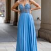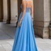 Seu corpo ajustado apresenta um belíssimo bordado de brilhante com aplicações de pedrarias, que um efeito cintilante que exala luxo e feminilidade. A saia fluida em chiffon, em um azul sereno e sofisticado, traz movimento e leveza, ideal para eventos glamourosos. As alças finas e os decotes profundos valorizam o colo, garantindo um toque de sensualidade e classe. Um vestido perfeito para quem deseja brilhar com requinte e charme.