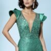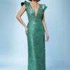 Vestido completo com diferentes tecidos de miçangas. Decote profundo na frente e abertura em losango nas costas. Ombreiras lisas com babados duplos.