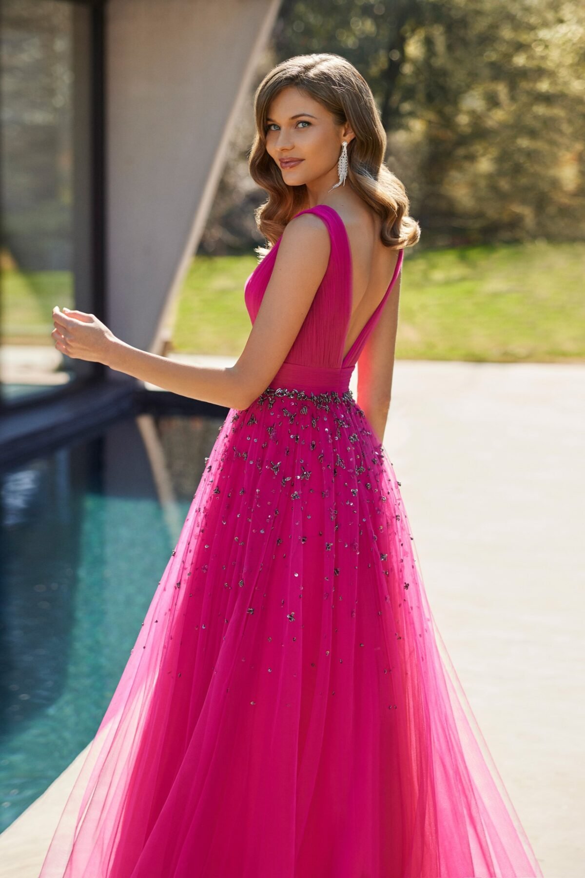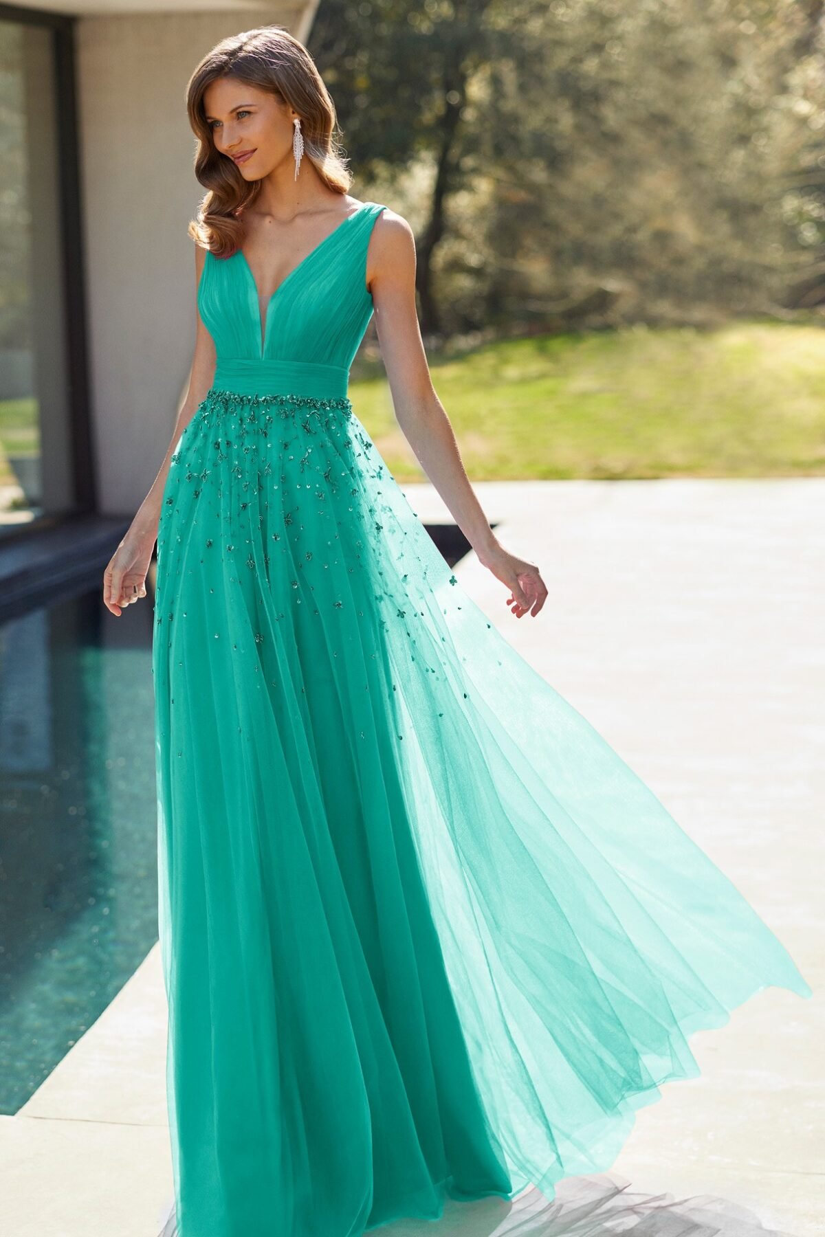 O brilho e a sofisticação unem-se neste deslumbrante vestido de festa da Marfil Barcelona, uma peça elegante e romântica, perfeita para eventos especiais onde o glamour é indispensável.