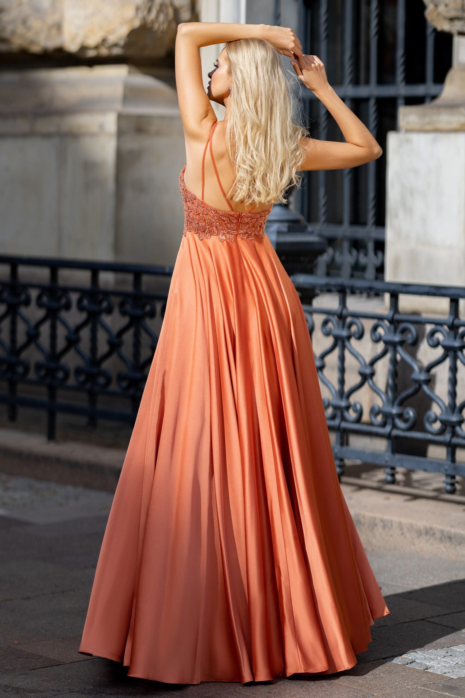 No caso do vestido da foto, Spicy Orange apresenta um brilho sutil, realçando ainda mais sua sofisticação. É uma cor perfeita para quem deseja um look impactante, cheio de personalidade e elegante.