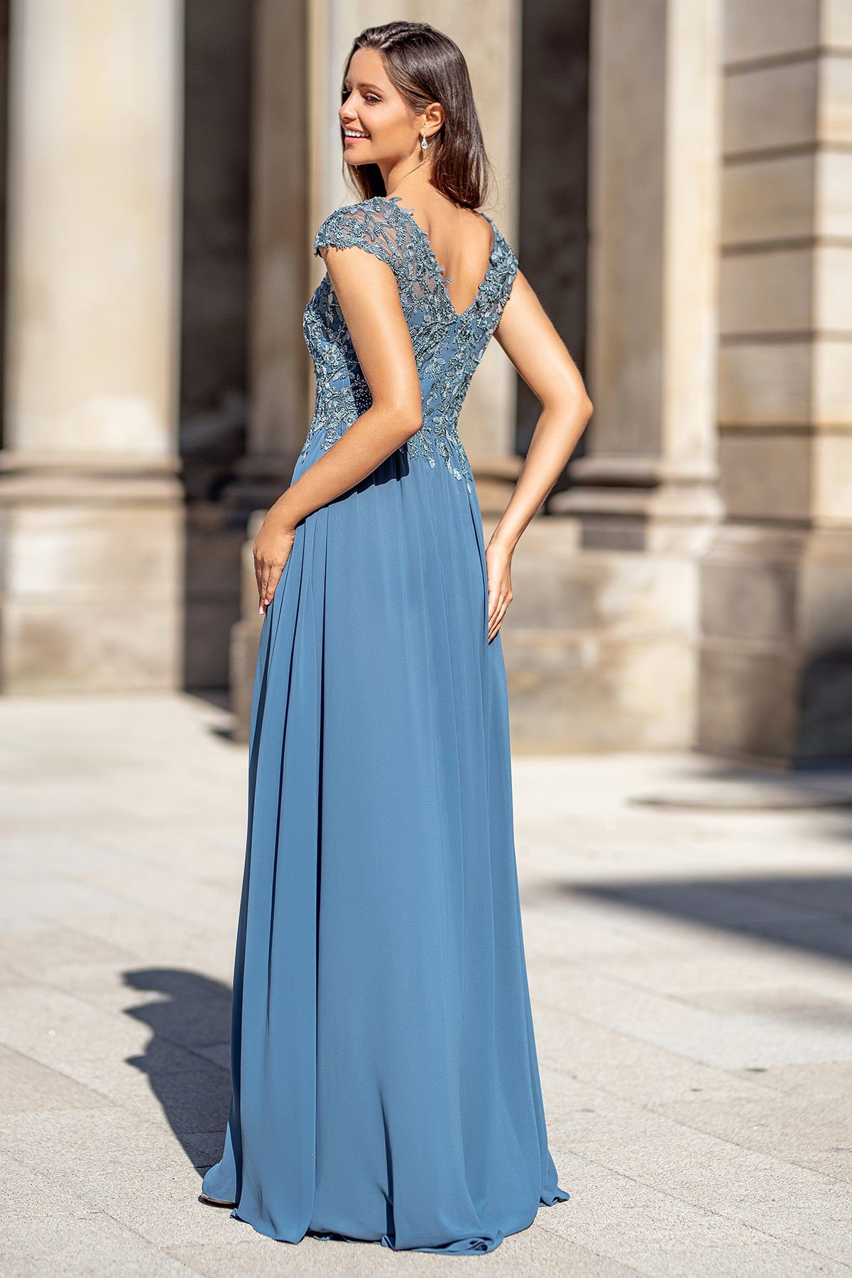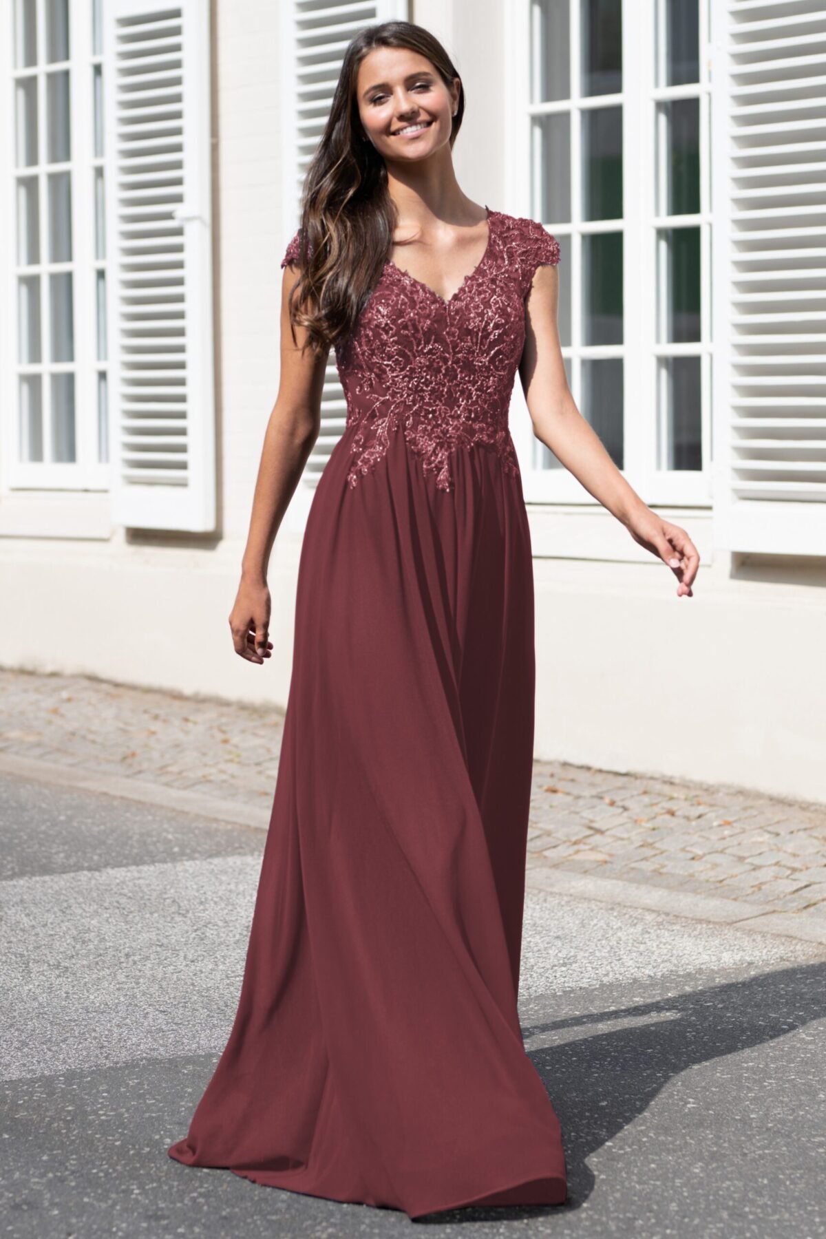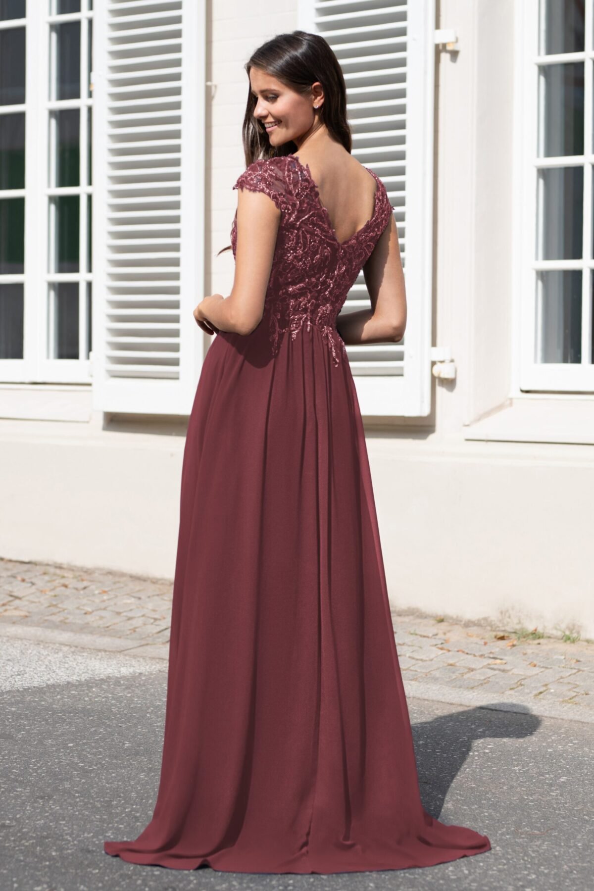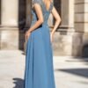 O corpete estruturado com delicados bordados em renda e pedrarias, que adicionam um brilho subtil e sofisticado. O decote em V profundo valoriza o colo, enquanto as delicadas mangas em renda proporcionam um toque de romantismo e exclusividade. A parte traseira com um decote discreto em V adiciona charme e elegância. A saia fluida em chiffon garante um caimento impecável, leveza e movimento, tornando este modelo perfeito para quem procura conforto sem abrir mão da sofisticação.