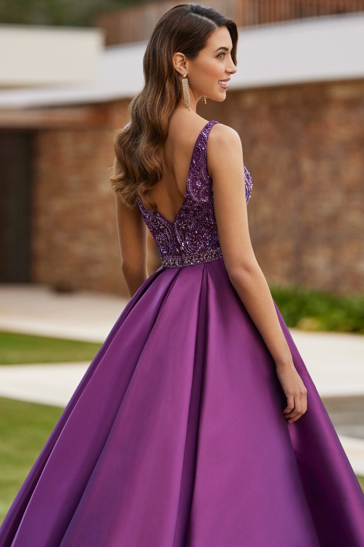 Este deslumbrante vestido longo de gala da marca Marfil Barcelona, uma peça que combina o estilo clássico com um toque moderno na cor púrpura, ideal para eventos sofisticados e inesquecíveis.