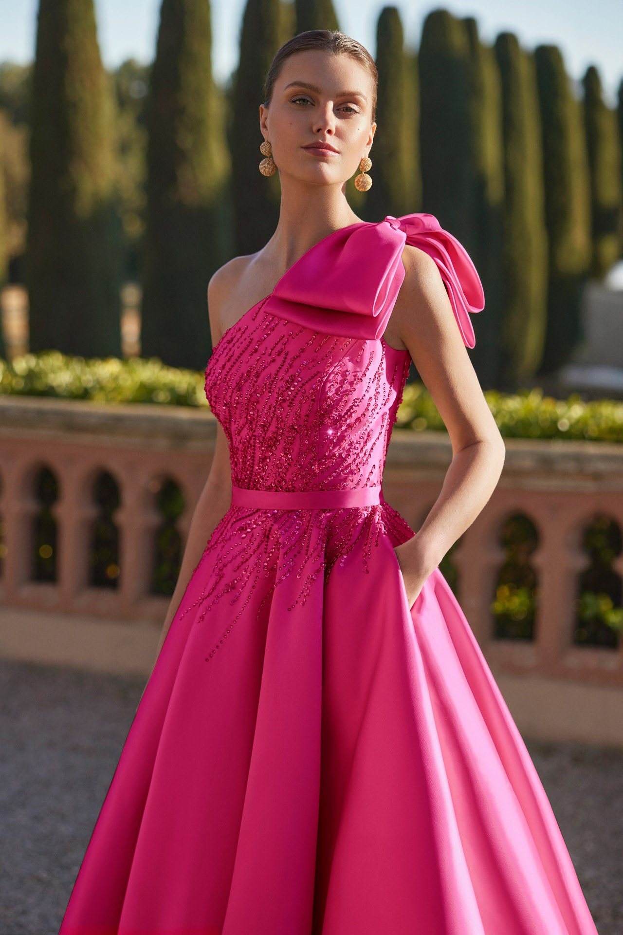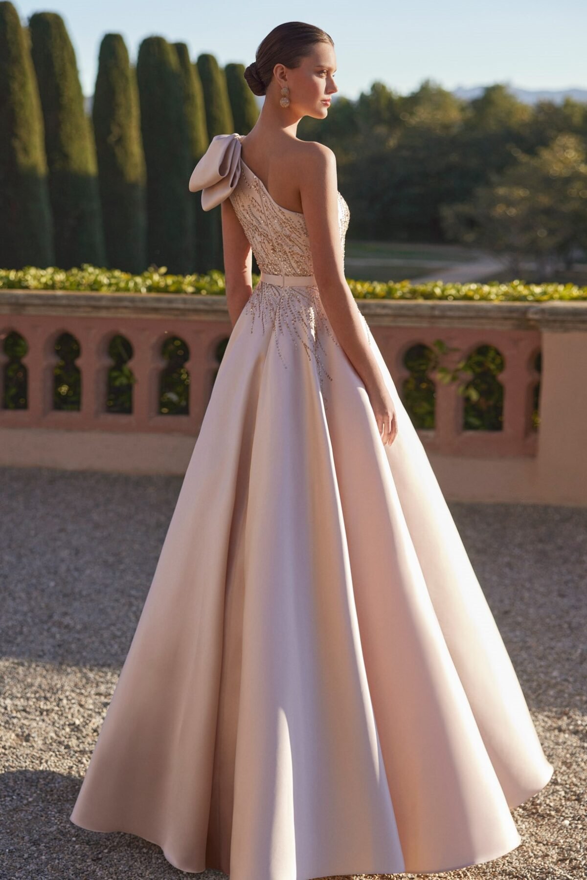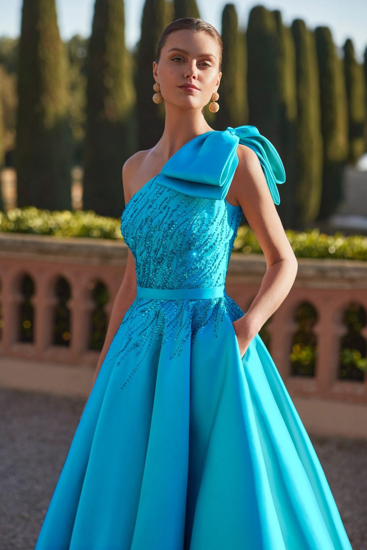 O decote assimétrico adiciona um toque moderno e refinado, enquanto o laço volumoso no ombro adiciona um charme extra e um ar de sofisticação. O corpete é ricamente adornado com pedraria, para brilho delicado e luxuoso ao look.