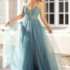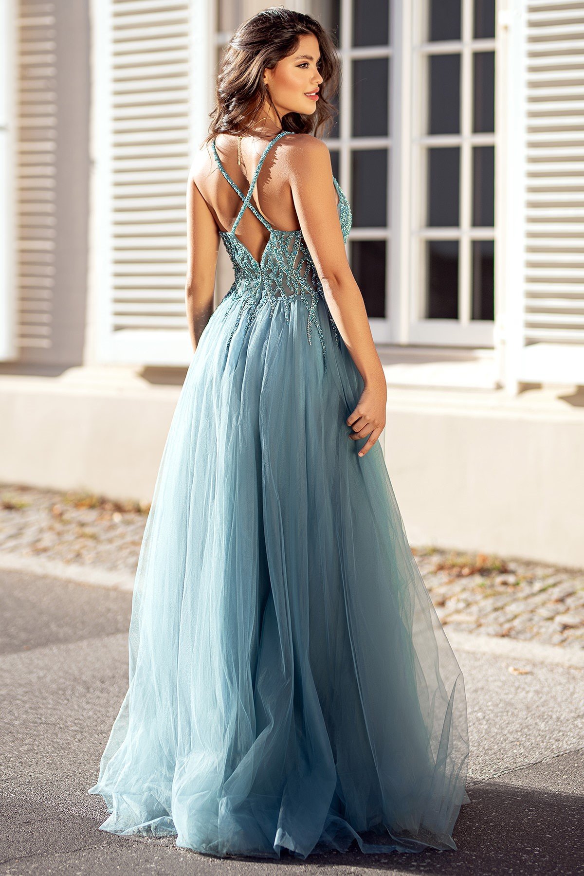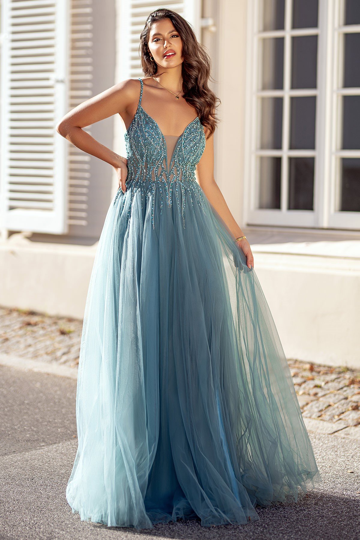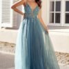 O corpete estruturado apresenta um decote profundo em V com tule ilusione, que proporciona um toque de sensualidade na medida certa. O bordado em pedrarias cria um efeito luminoso e refinado, destacando-se no tecido fluído de tule. As alças finas complementam o design, acrescentado leveza e um caimento impecável. Já a saia com abertura lateral que adiciona movimento e charme ao look.