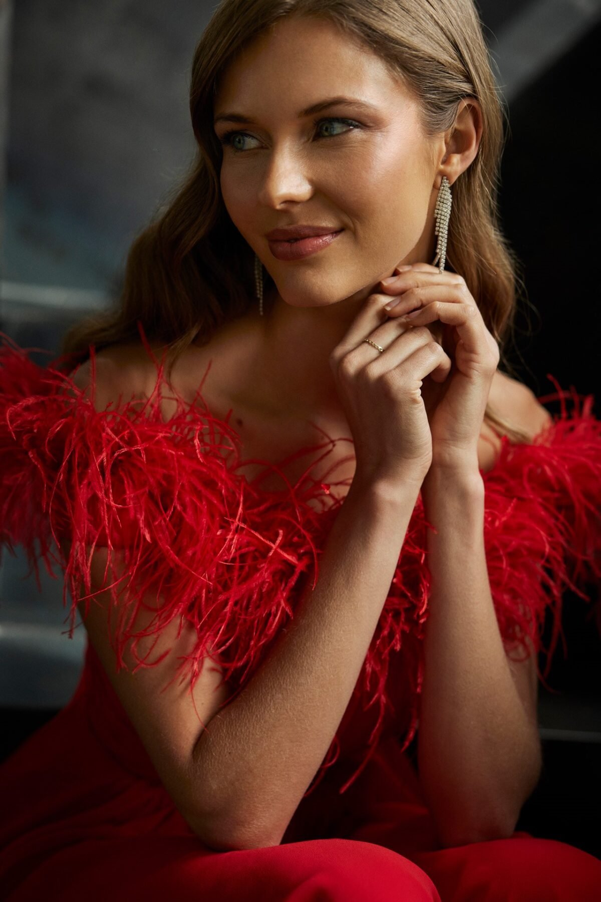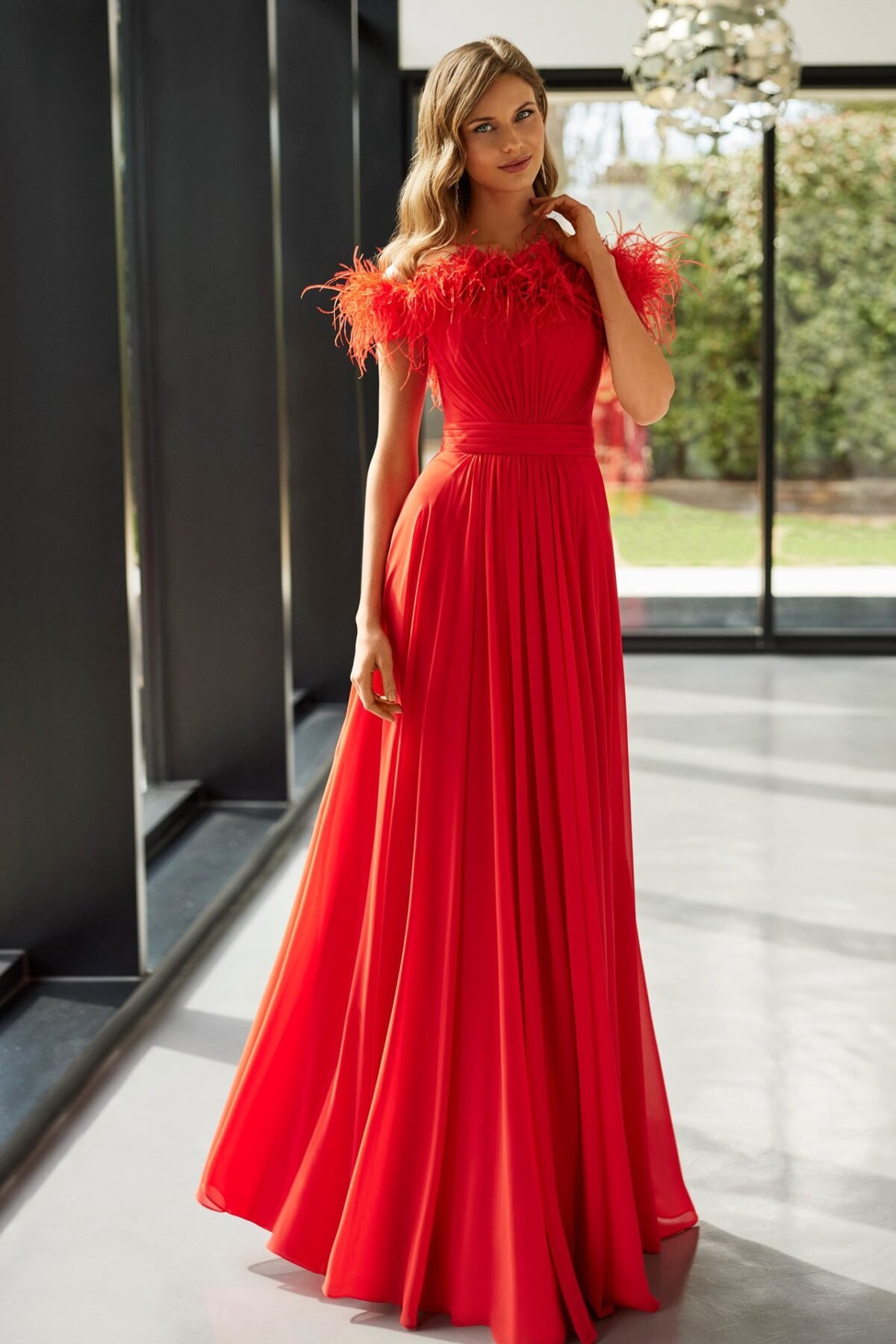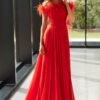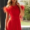 O vestido apresenta um corte fluido e esvoaçante, confecionado em um tecido chiffon leve e de excelente caimento, proporciona movimento gracioso a cada passo. A silhueta acinturada é valorizada por uma faixa drapeada que destaca a cintura, criando um efeito alongado e harmonioso para qualquer tipo de corpo. O grande diferencial desta peça está na sua parte superior, onde um delicado decote ombro a ombro é enfeitado com plumas exuberantes, adicionando um toque de sofisticação e glamour. As plumas trazem um elemento de moda contemporânea e dão um ar ousado sem perder a delicadeza. O corpete é trabalhado com um drapeado estratégico, realçando a região do busto com muito requinte.