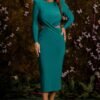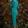 VESTIDO MIDI AZUL PETRÓLEO COM MANGA LONGA E DETALHE DRAPEADO NA CINTURA