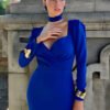 VESTIDO MIDI AZUL ROYAL COM DECOTE CORAÇÃO, MANGA LONGA E DETALHE DE GARGANTILHA