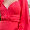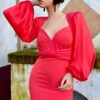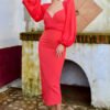 VESTIDO MIDI COM MANGAS BUFANTES E DECOTE CORAÇÃO DRAPEADO NA CINTURA