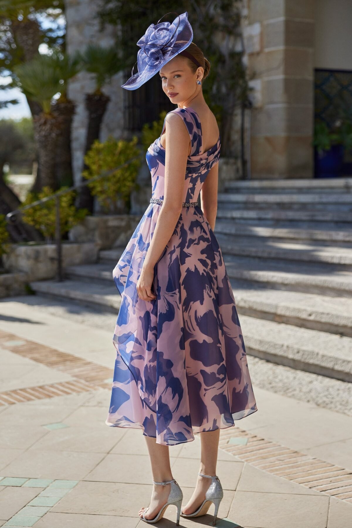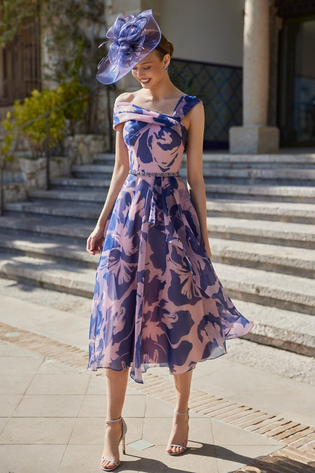 Este elegante vestido midi é confecionado em organza estampada nos tons de rosa e azul marinho, para um visual sofisticado e fluído.