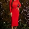 VESTIDO MIDI VERMELHO COM MANGA LONGA E DETALHE DRAPEADO NA CINTURA
