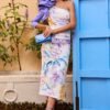 Este vestido midi, de corte justo, destaca-se pelo seu padrão floral em tons lavanda, lilás e amarelo, desenhado sobre fundo branco. O design assimétrico, com uma única manga estruturada em tecido tafetá lilás volumoso, dá-lhe um toque artístico e irreverente. O modelo é drapeado ao longo do corpo, realçando a silhueta com sofisticação e frescura.