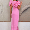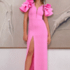 Este vestido encantador destaca-se pelas mangas em babados volumosos e esculturais, que adicionam um ar artístico e contemporâneo.