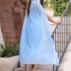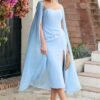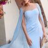 Inspirado na leveza da brisa mediterrânica, este vestido azul celeste funde elegância clássica com um toque etéreo e contemporâneo. O corpete estruturado apresenta um decote em forma de coração suavemente moldado por um tule ilusão nude, que se estende aos ombros e serve de base para a verdadeira protagonista do design: a capa flutuante em chiffon, fixada ao topo do vestido e aberta ao longo dos braços, criando um efeito visual dramático e delicado ao mesmo tempo.