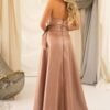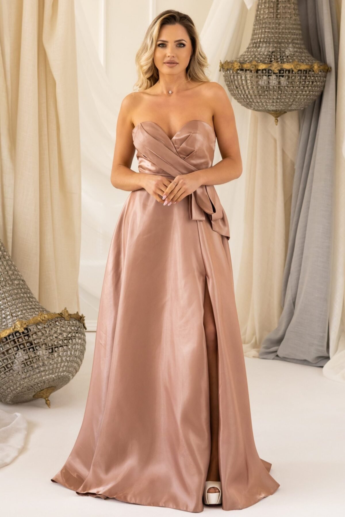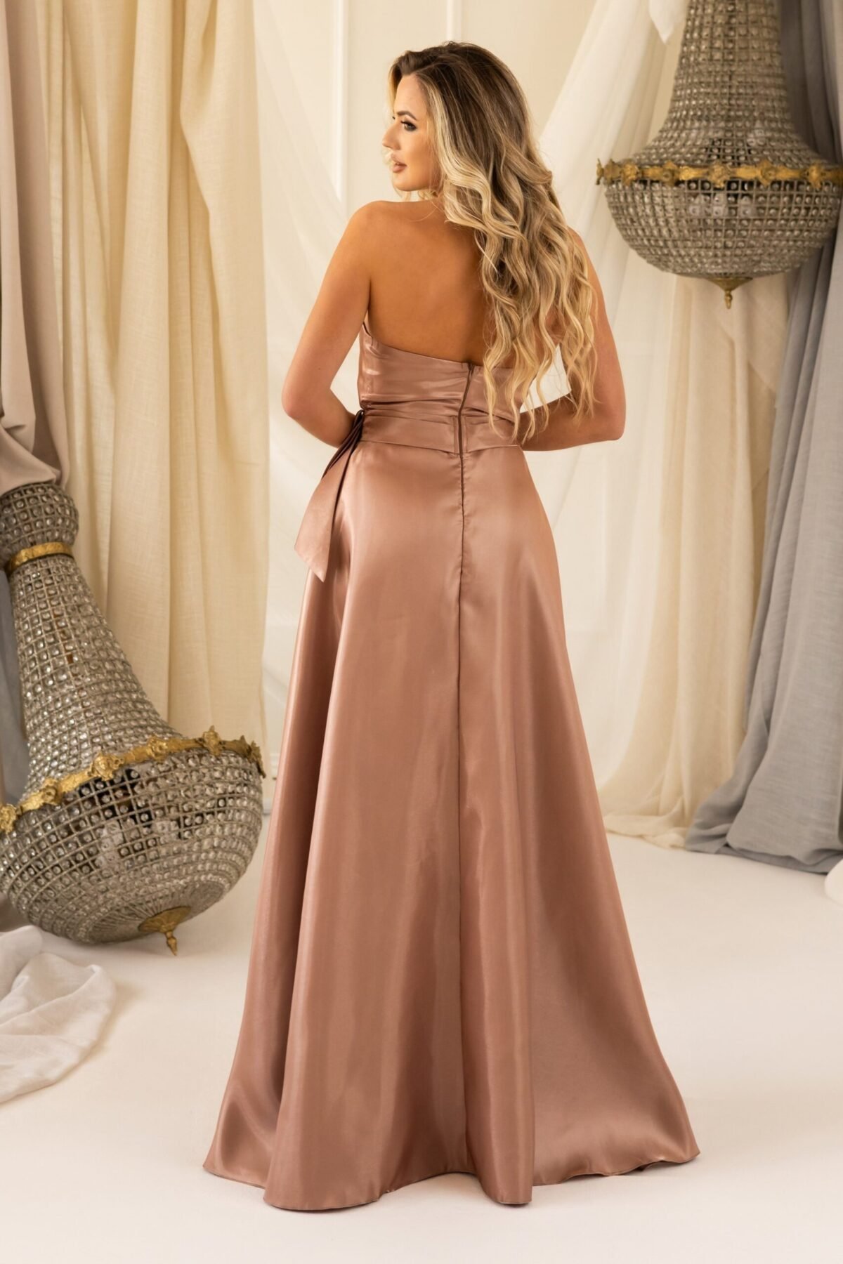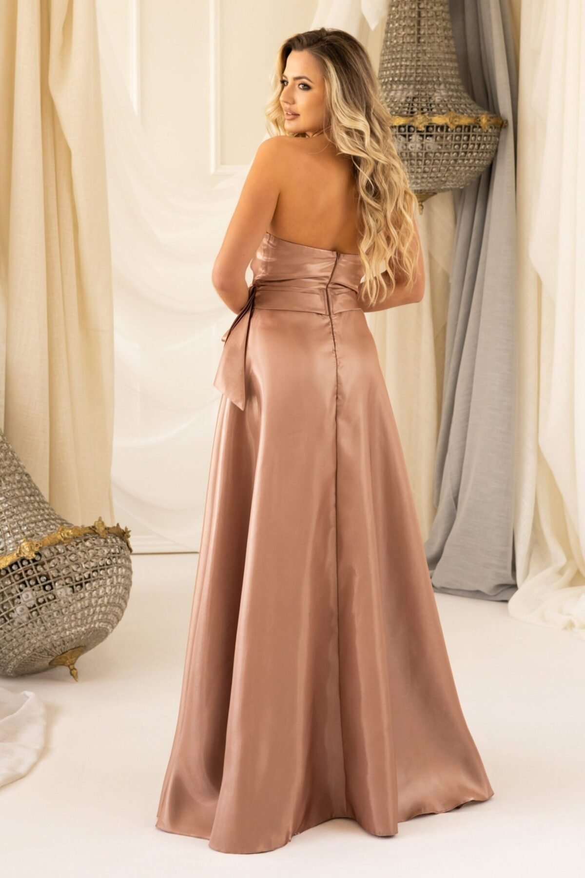 Confecionado em tecido acetinado, com um brilho sofisticado na tonalidade Bronze. O corpete estruturado realça a silhueta, enquanto a sobreposição de tecido drapeado na zona do busto adiciona um toque refinado ao modelo.