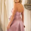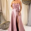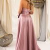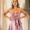 Confecionado em tecido acetinado, com um brilho sofisticado na tonalidade Rosa velho. O corpete estruturado realça a silhueta, enquanto a sobreposição de tecido drapeado na zona do busto adiciona um toque refinado ao modelo.
