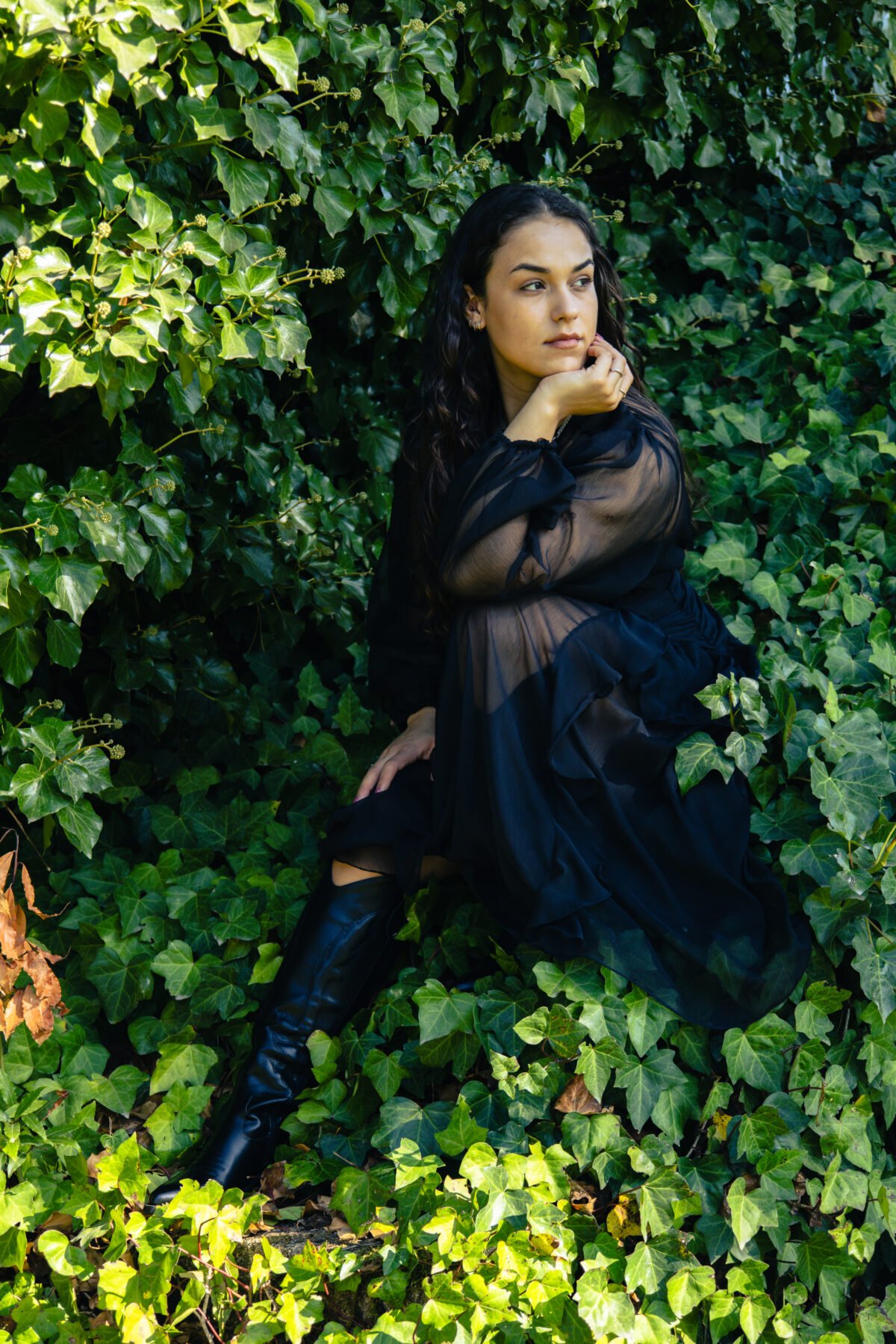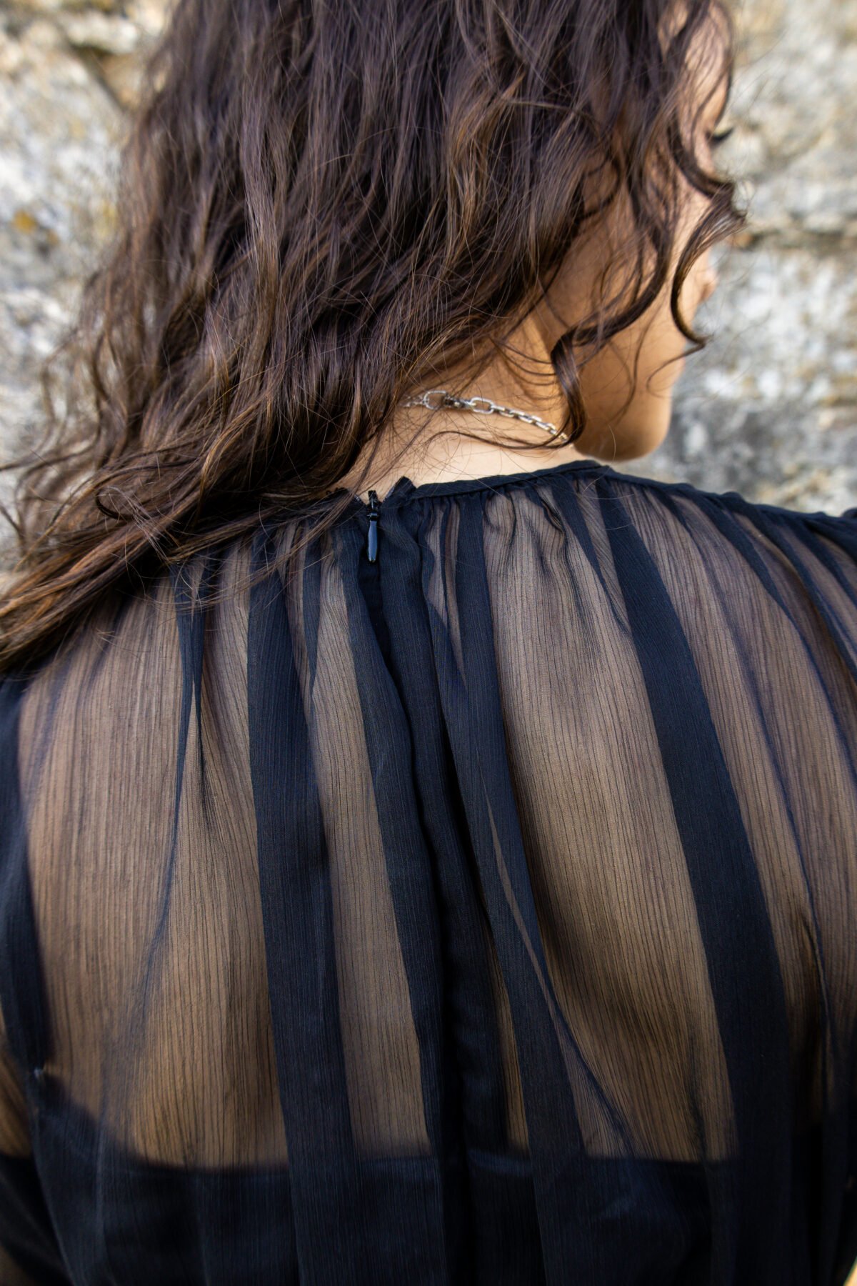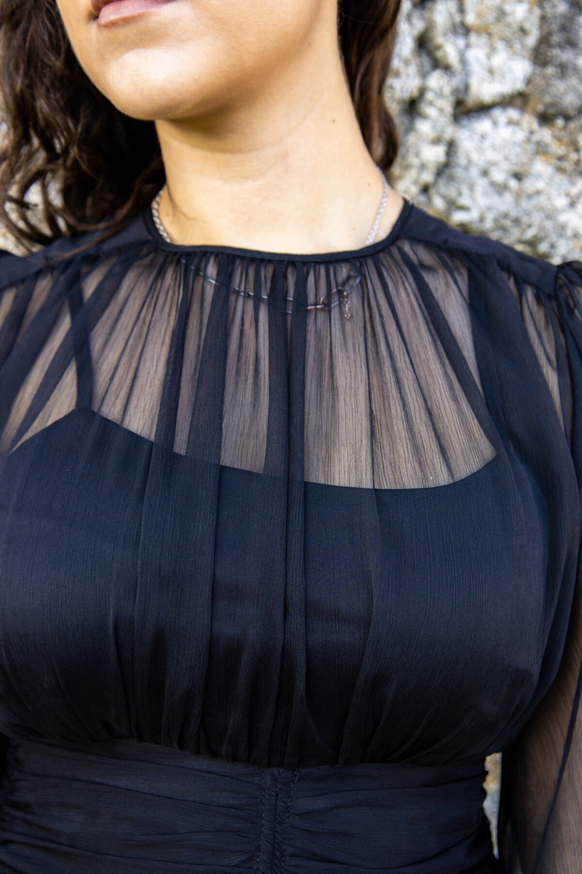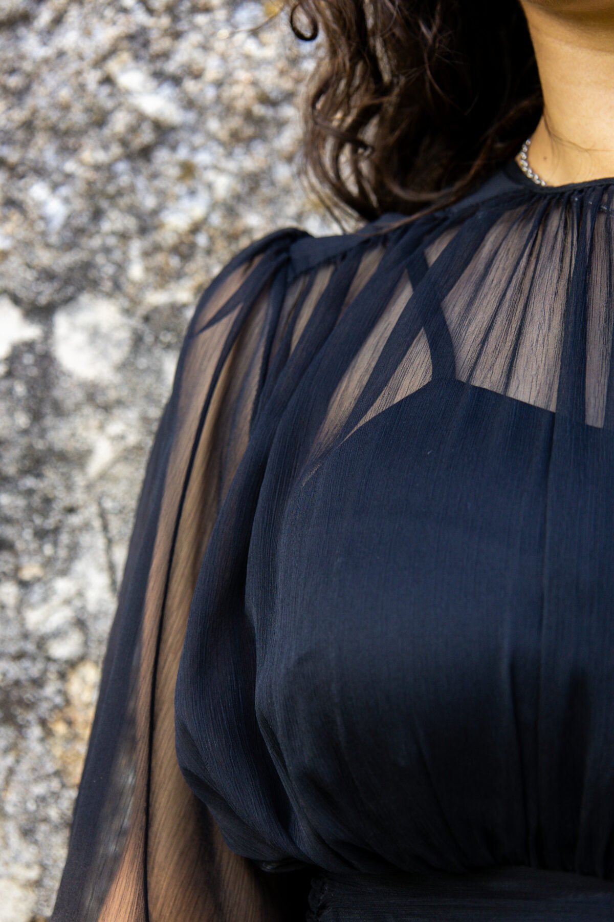 O design aposta numa silhueta fluída com cintura marcada, graças ao efeito franzido estrategicamente posicionado, que valoriza as formas de maneira subtil. As mangas compridas em chiffon transparente acrescentam um toque de mistério e delicadeza, equilibrando modernidade com romantismo. O decote redondo, aliado às pregas discretas na zona do peito, reforça a feminilidade da peça.