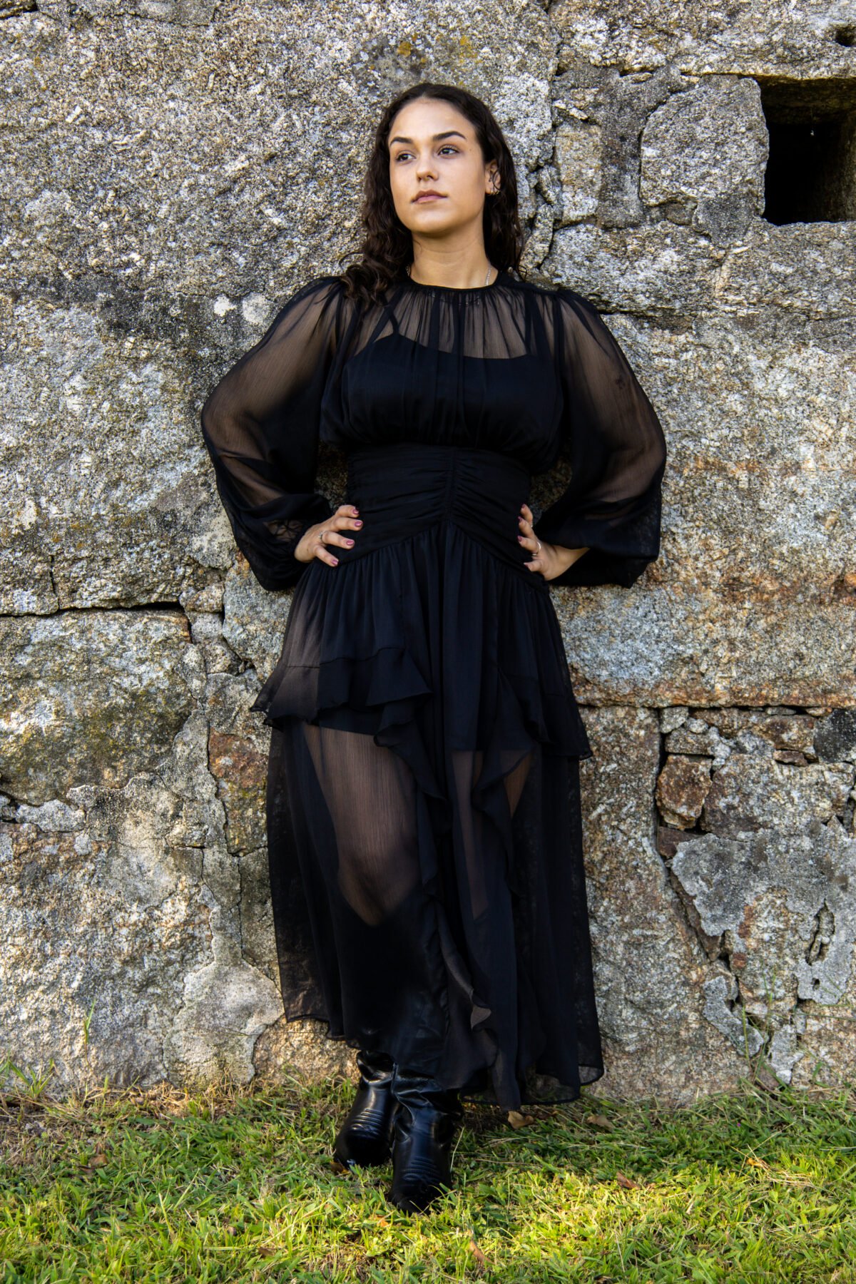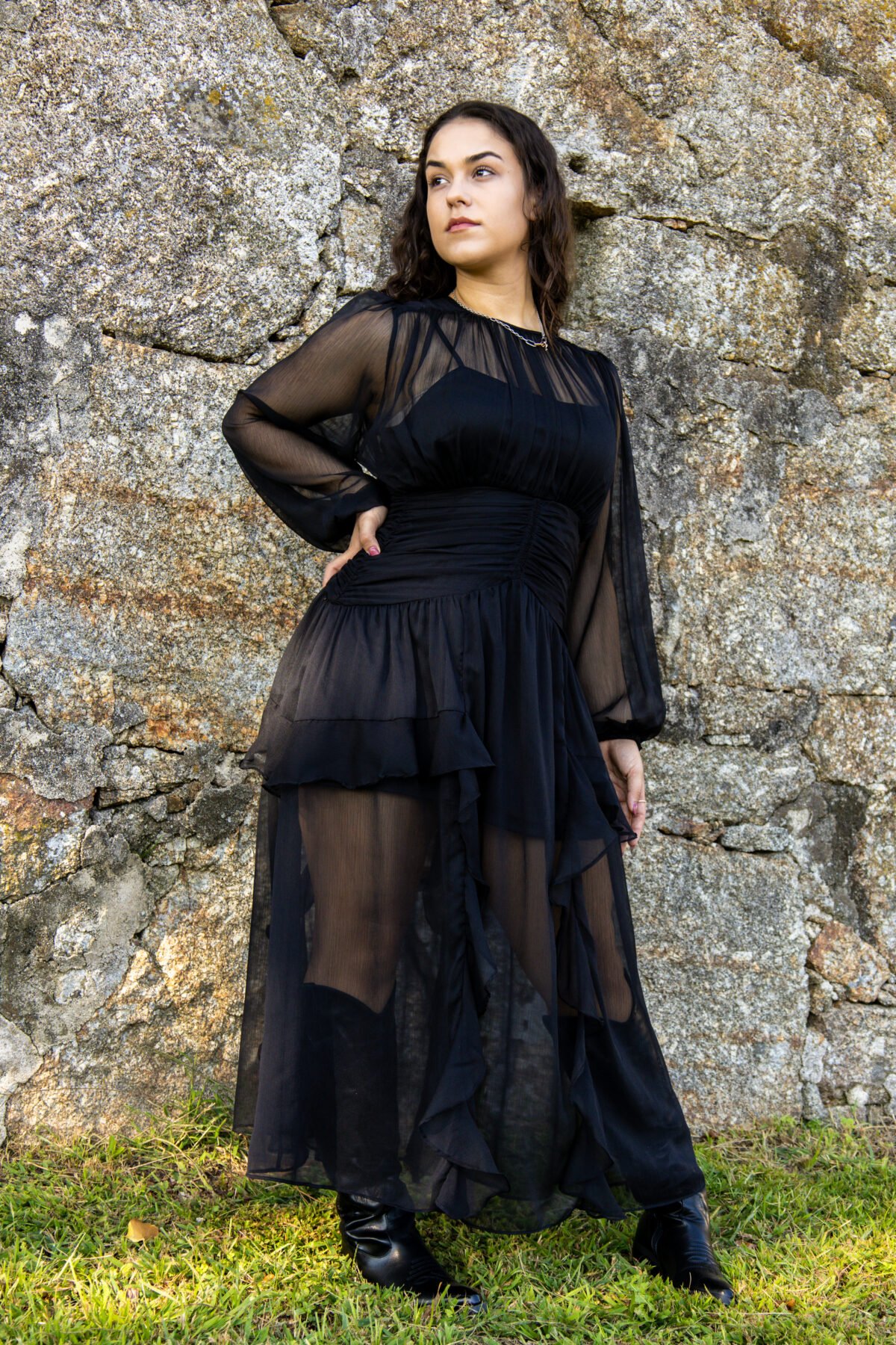 Este vestido preto em chiffon é a escolha ideal para quem procura elegância, sofisticação e um toque de ousadia. Confecionado num tecido leve, fluído e delicadamente transparente, proporciona um caimento impecável, transmitindo movimento e feminilidade a cada passo. A leveza do chiffon torna a peça confortável de usar, ao mesmo tempo que lhe confere um ar etéreo e refinado, perfeito para ocasiões especiais ou para composições mais arrojadas no quotidiano.
