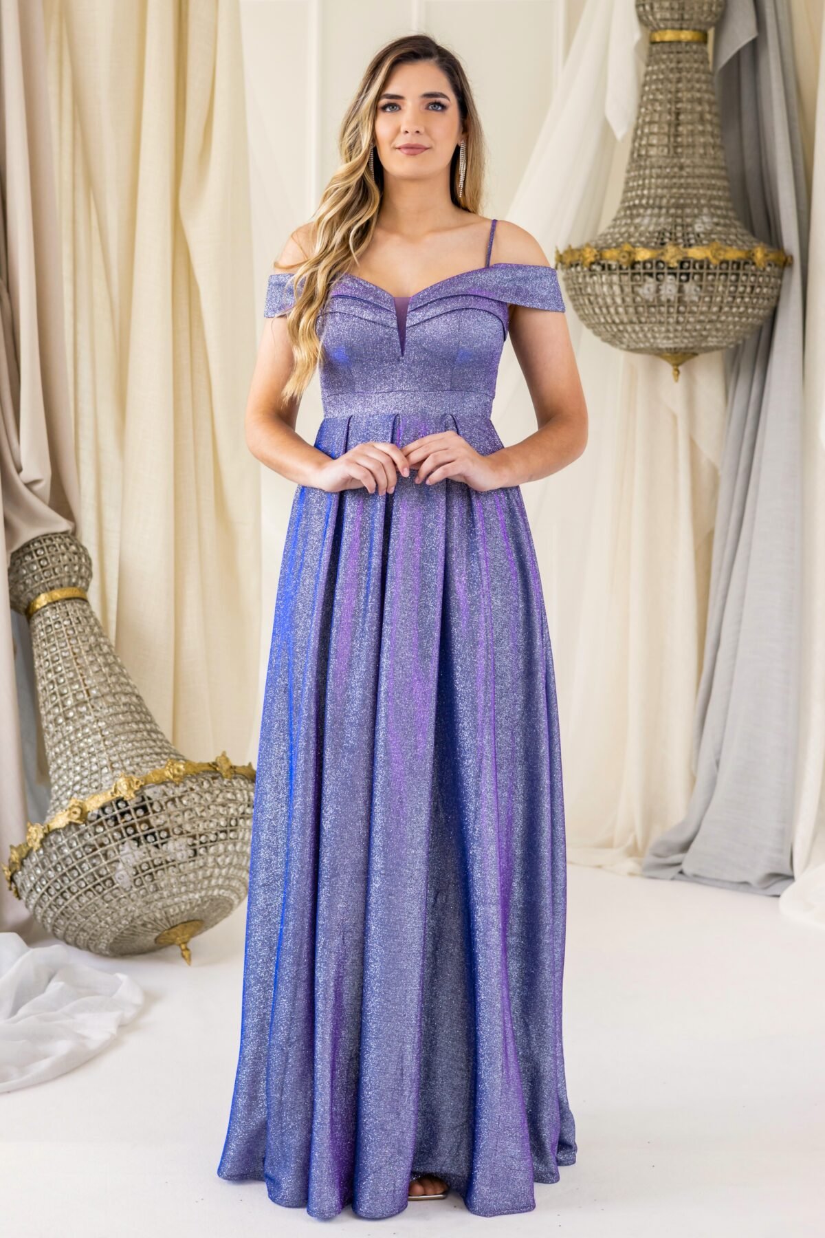 A cintura marcada dá lugar a uma saia longa fluida com pregas, que desliza com leveza e movimento. O tecido com glitter capta a luz de forma deslumbrante, criando reflexos em tons lilás e rosas que elevam ainda mais o charme da peça.