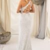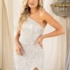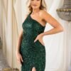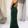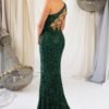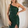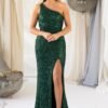 Com um corte elegante de um só ombro e aplicação integral de lantejoulas finas, este modelo destaca-se pela sua silhueta ajustada e pela racha frontal, que acrescenta movimento e sensualidade.