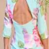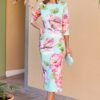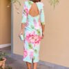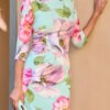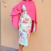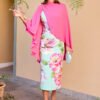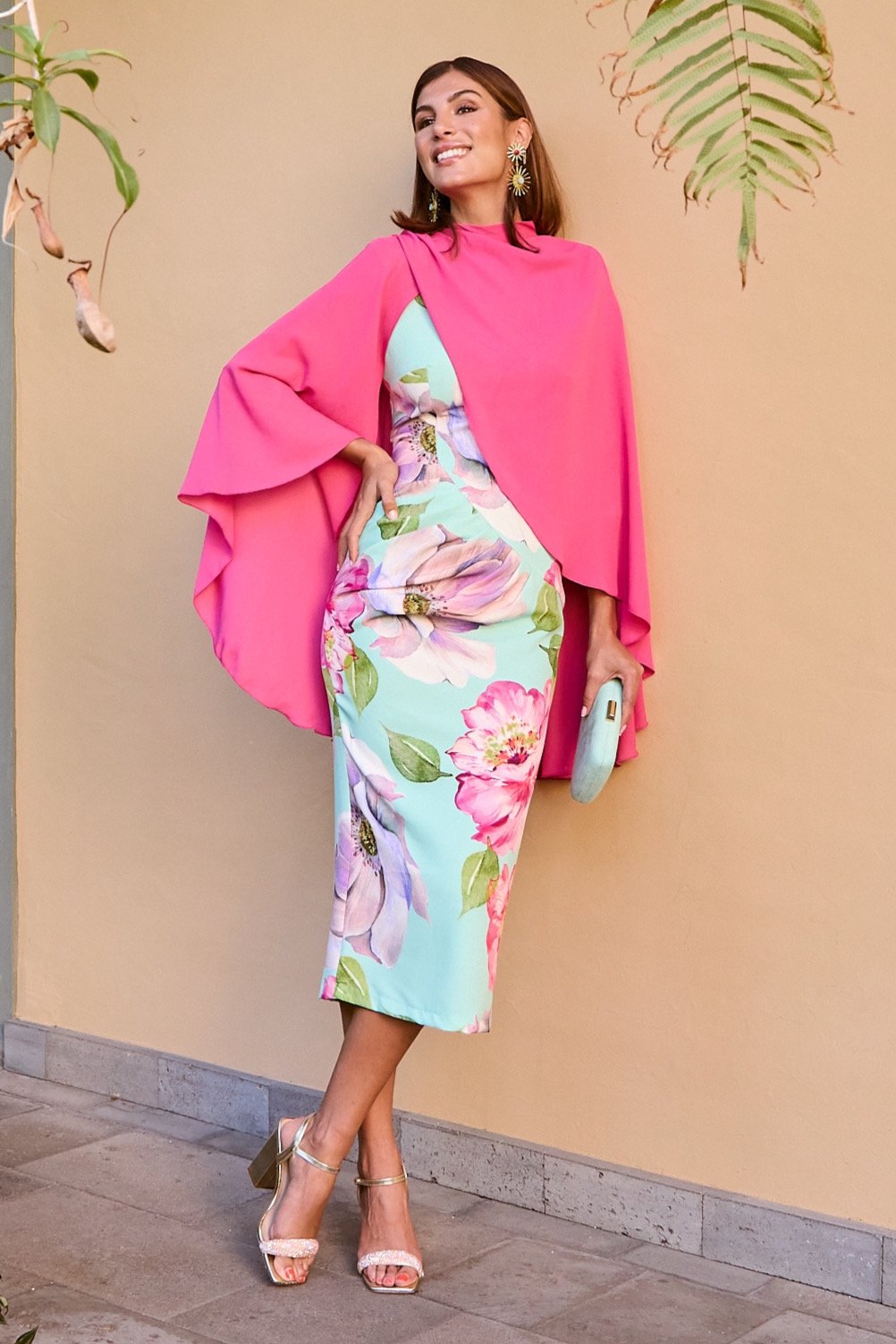 Vestido midi de estampado floral em tons pastel, com corte ajustado que realça a silhueta e mangas a três quartos. A peça inclui também uma capa amovível em rosa fúcsia, adicionando elegância e versatilidade — ideal tanto para eventos ao ar livre como cerimónias mais formais.