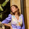 Com estampa floral delicada em tons pastel e mangas 3/4 bufantes em tafetá lavanda, conquista pela originalidade e feminilidade.