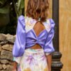 O decote em V trespassado valoriza o colo e detalhes drapeados que realçam a silhueta. O laço frontal largo, também em tafetá lavanda, acrescenta um toque moderno e estilizado. O verdadeiro destaque está nas costas: recorte em gota e o nó torcido proporcionam um efeito surpreendente, revelando sutilmente a pele de forma inesperada e muito feminina.