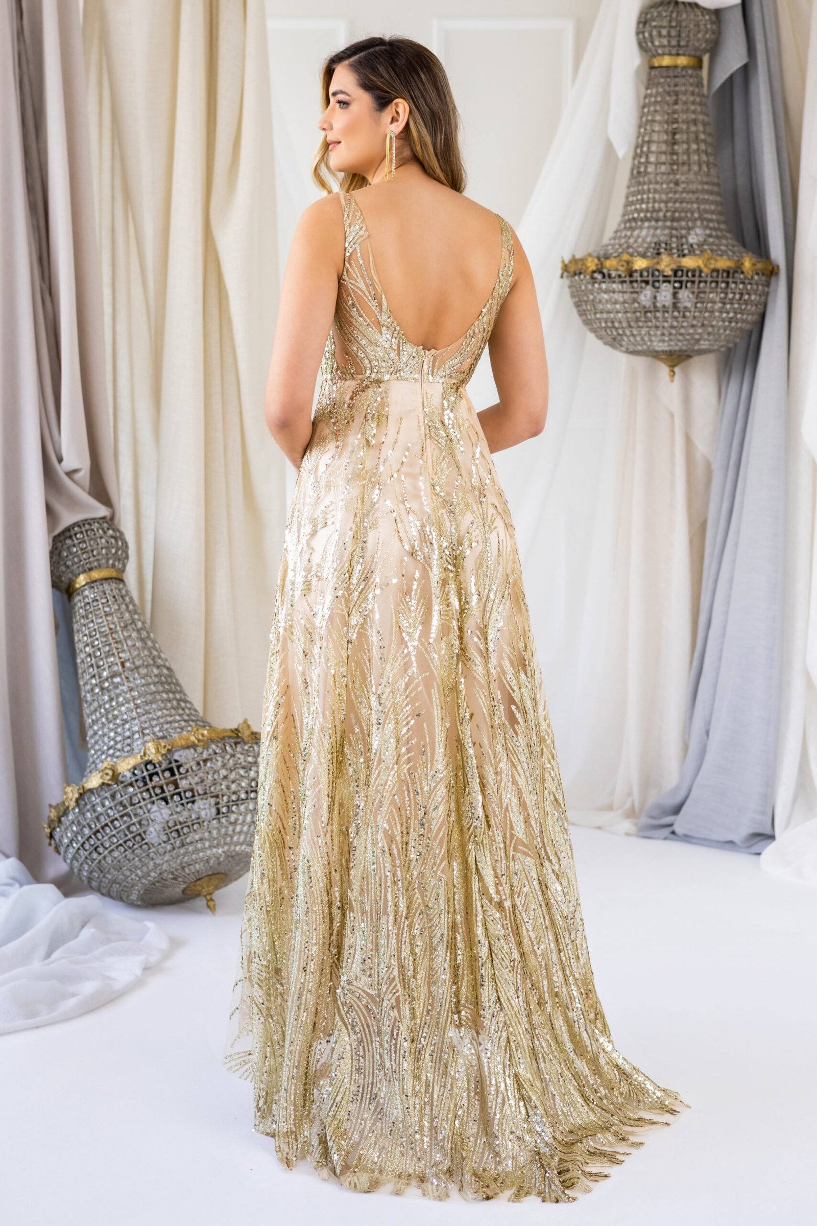 Encante-se com vestido vitória, uma verdadeira obra-prima de brilho e sofisticação. Este modelo comprido apresenta um deslumbrante brilho de strass e lantejoulas que forma um padrão elegante de inspiração botânica, elevando o glamour em qualquer evento formal.